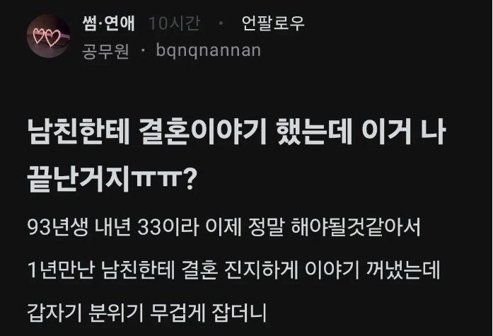 ✍️ 남친한테 결혼이야기 했는데 이거 나 끝난거지ㅠㅠ?